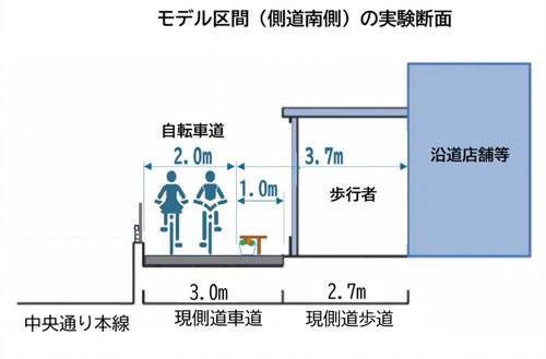 車道を走ることに抵抗がある自転車利用者のために、安全で快適な走行空間を確保し、歩行者との接触リスクを減らす目的でも行われた。その空間確保のために、車道の中央線(オレンジライン)の書き換えを行い、車線分離のためにラバーポールを設置するなど、大掛かりな作業が含まれた。実験の検証は、主にビデオ撮影による利用状況の分析とアンケート調査によって、今後進められていくという。