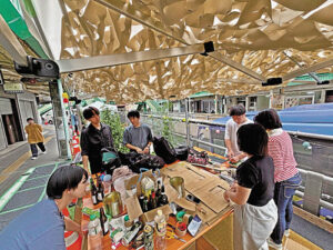 関西大学の社会安全学部の学生は沿道店舗を回って集めた廃材で防災グッズを制作・展示した。