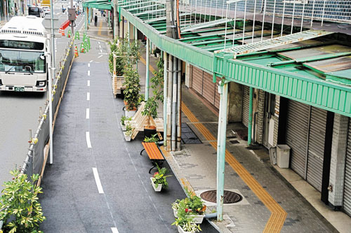 社会実験が行われたJR茨木駅近くの「中央通り」。側道への車の進入を制限して、