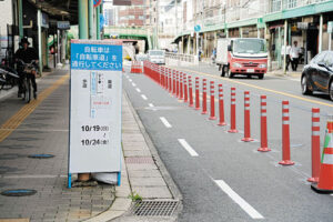 その一環として10月に行われたのが、社会実験『みちクル』だ。これは、JR茨木駅近くの『中央通り側道』で自動車の進入を制限し、自転車と歩行者だけが通る空間を作り、利用状況について確認した。