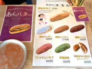 種類はコチラ。「黄金きな粉/250円」「純白シュガー/240円」「爽快シナモン/270円」「濃厚ココア/300円」「フレッシュいちご/300円」「伊勢抹茶/300円」「淡路島玉ねぎ使用!カレーパン/300円」「あんバタートッピング/150円」。今回は、「黄金きな粉」「フレッシュいちご」「伊勢抹茶」の3つをチョイスしました!(^^)!