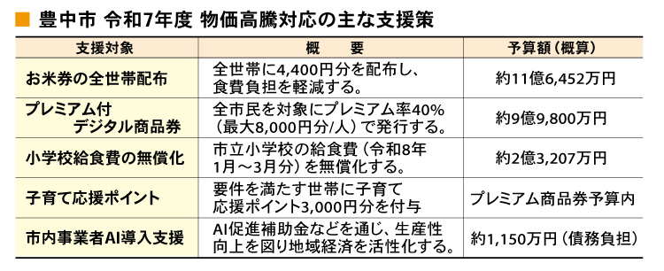 豊中市は11月28日、市議会12月定例会に追加の補正予算案を提出した。今回の予算案は、長引く物価高騰から市民生活を守る「家計・生活応援策」と、千里中央地区の再生など「未来への投資」の2本柱で構成されている。