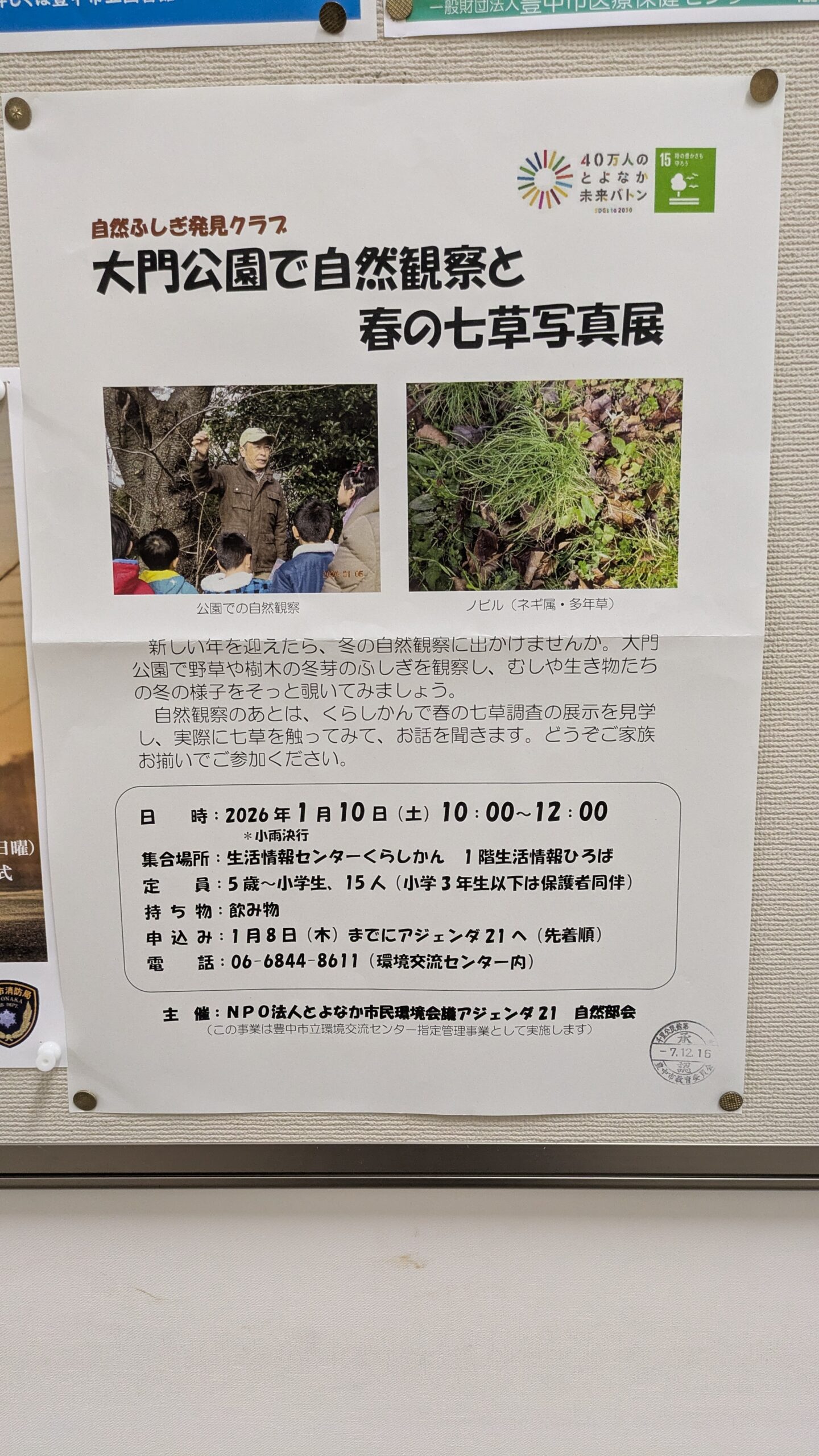 自然ふしぎ発見クラブによる「大門公園で自然観察と春の七草写真展」が、令和8年1月10日(土)に開催される。
