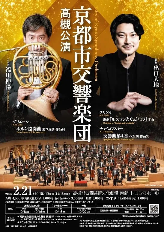 2月21日(土)、高槻城公園芸術文化劇場で京都市交響楽団による公演が開催。世界的に活躍する指揮者出口大地氏とホルン奏者福川伸陽氏を迎えて、チャイコフスキー作曲「交響曲第4番ヘ短調作品36」、グリエール作曲「ホルン協奏曲変ロ長調作品91」などクラシックの名曲を演奏する。