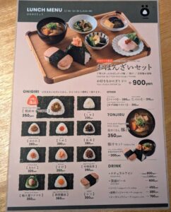 メニューはこちら。「おばんざいセット(好きなおにぎり2つ)/+900円」。おにぎりは「箕面ゆず肉味噌/350円」「しお/220円」「おかか/280円」「うめ/280円」「昆布/280円」「たらこ/320円」「さけ/350円」「牛時雨煮/350円」「梅大葉ツナマヨ/350円」「卵黄醤油/360円」「ロコ/300円」「ツナマヨ/280円」「しそロコ/310円」「ゆず胡椒マヨロコ/310円」。「具だくさん豚汁/350円」「豚汁セット(好きなおにぎり)/+300円」今回は、「おばんざいセット」で「箕面ゆず肉味噌」「昆布」をチョイスしました。