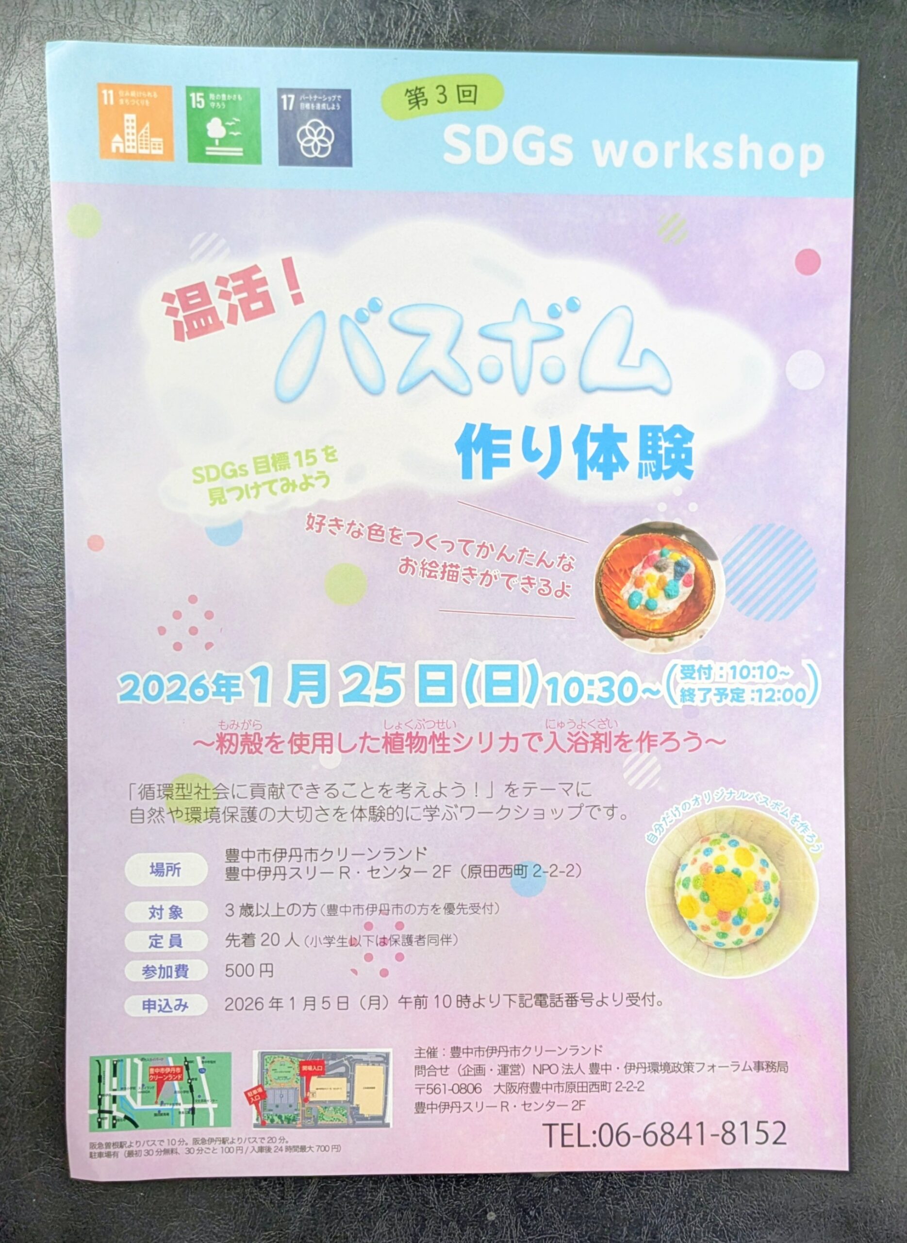 -豊中市・伊丹市-【クリーンランド】で『第3回SDGsワークショップ「温活バスボム作り体験」SDGs目標15を見つけてみよう』1月25日(日)