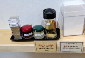 カウンター上には、味変用の薬味がずらりと並び、自分好みに調整できるのも嬉しいポイント。