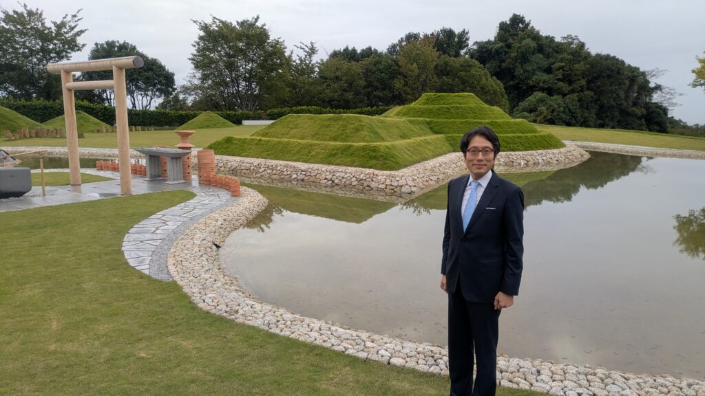 3世紀の再現と「神仏習合」への想い竹田氏がこだわるのは、単なる「形」だけではない。モデルとしているのは、ヤマト王権が発足し、日本という国が統合されていった3世紀頃の古墳だ。円筒埴輪や、三種の神器(御剣、御勾玉など)の副葬品まで、当時の職人技術を用いて忠実に再現している。さらに画期的なのは、仏教霊園の中にありながら神道の形式を取り入れた「神仏習合」のスタイルである点だ。「大阪メモリアルパークは仏教の霊園ですが、そこに神道の施設である鳥居や前方後円墳を建てることを快く認めてくれました。お寺の霊園で神主さんが祭祀を行うというのは、現代ではあまり例がありません。かつての日本にあった『神仏習合』の美しい姿を、この令和の時代に少しでも取り戻せたら……そんな願いも込めています」。