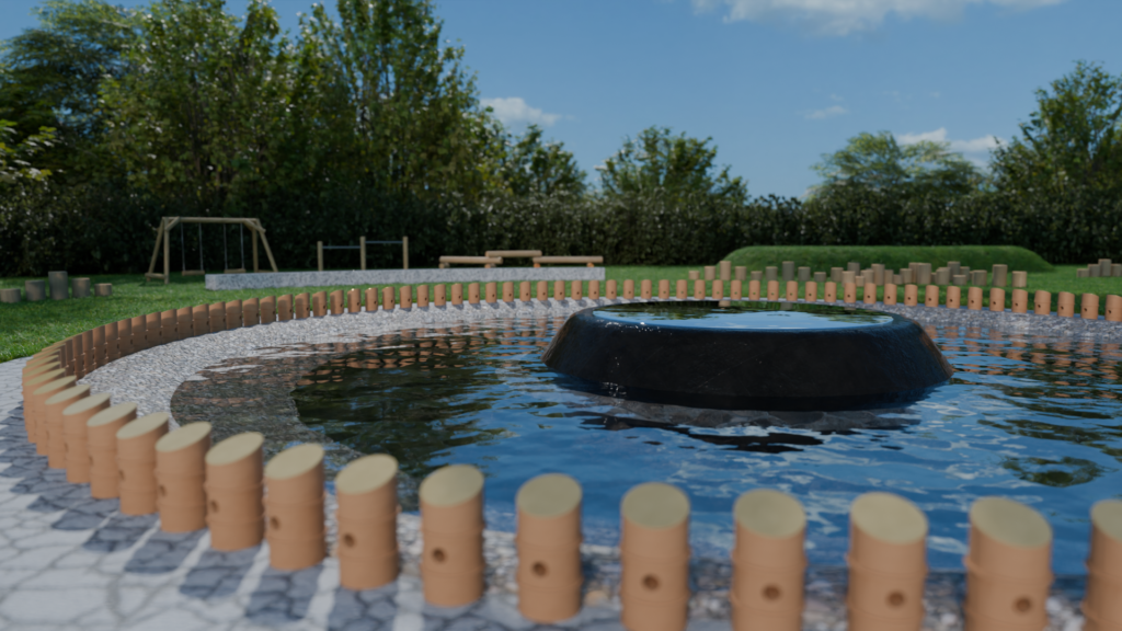 池の外周に結界として立ち並ぶ円筒埴輪に、故人の名と生没年月日を刻んだプレートが取り付けられる。