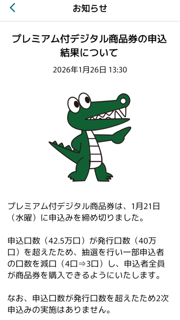申込口数(42.5万口)が発行口数(40万口)を超えたため、抽選を行い一部申込者の口数を減口(4口⇒3口)し、申込者全員が商品券を購入できるようになったようです◎