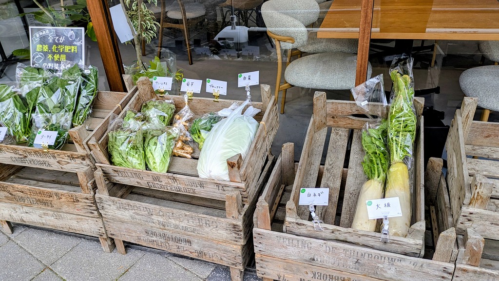 使用する食材は能勢の野菜を中心にセレクトされており、店舗の外では野菜の販売も行われています。
