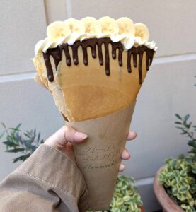 ここのクレープの特徴は〝パンとエスプレッソ〟と〝バズグルメクリエイターウルフ〟が年半かけて共同開発したパリパリ黄金クレープとあって楽しみ☆メニューはコチラ。シュガー系「バターシュガー/880円」「レモンシュガー/900円」。クリーム系「カスタードと生クリーム/1100円」「チョコメルトバナナ/1300円」「ゆずと生クリーム(箕面限定)/1300円」「いちごチョコメルト(季節限定)/1600円」。テイクアウトドリンク「コーヒー(ICE・HOT)/450円」「カフェラテ(ICE・HOT)/580円」。今回は、「チョコメルトバナナ」をチョイスしました☆