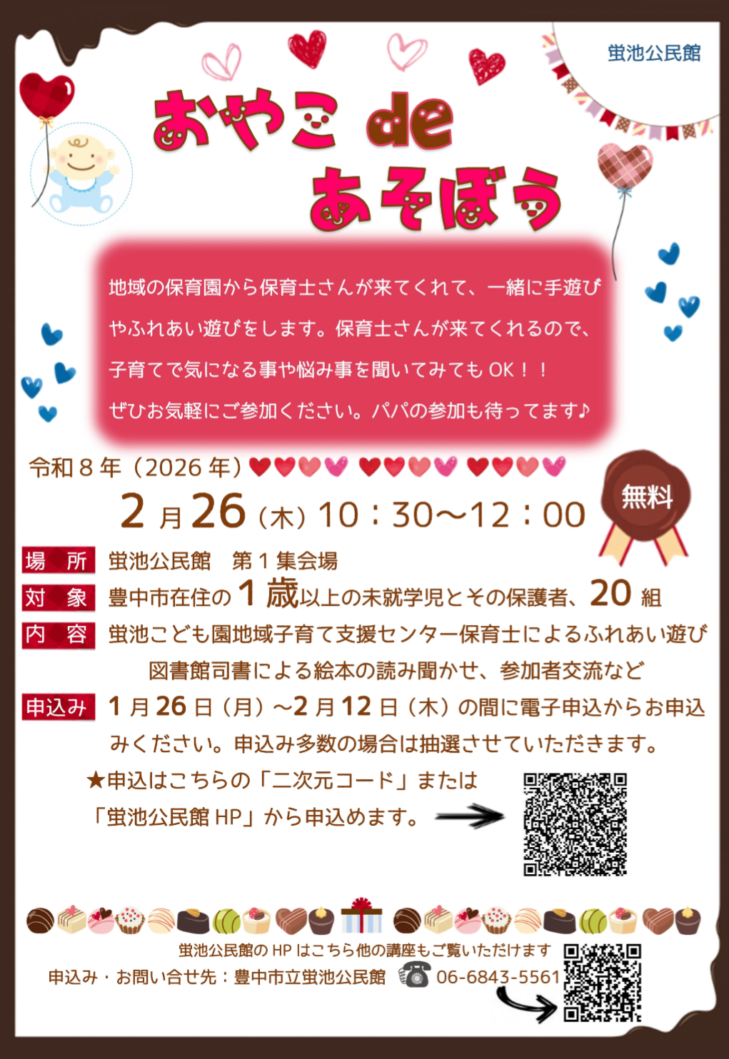 2月26日(木)、蛍池公民館で1歳以上を対象とした「おやこdeあそぼう」が開催される。