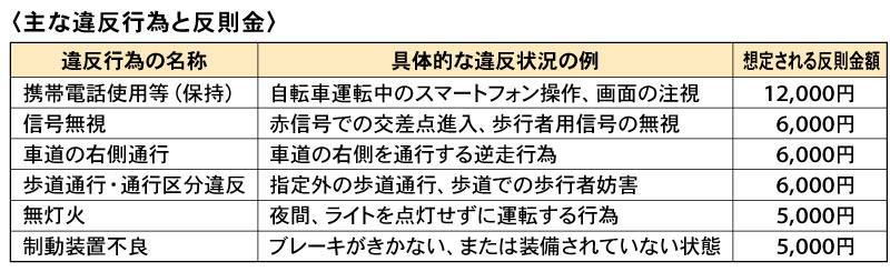 車道の右側を通行する逆走行為や信号無視、「普通自転車歩道通行可」の標識のない指定外の歩道通行、過度なスピードや、ベルを過剰に鳴らすなど歩行者妨害に対する反則金は6,000円。スマートフォンの「ながら運転」は、画面を注視したことによる事故が多発しており、非常に危険な行為として12,000円と高く設定されています。また、急な雨の日の傘差し運転や、イヤホンで音楽を聴きながらの運転も取り締まりの対象となるので知らなかったということが無いようにしておきたいですね。