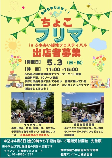 -豊中市-【ふれあい緑地】「ちょこフリマ」出店者申し込み受付中 開催日5月3日(日・祝)