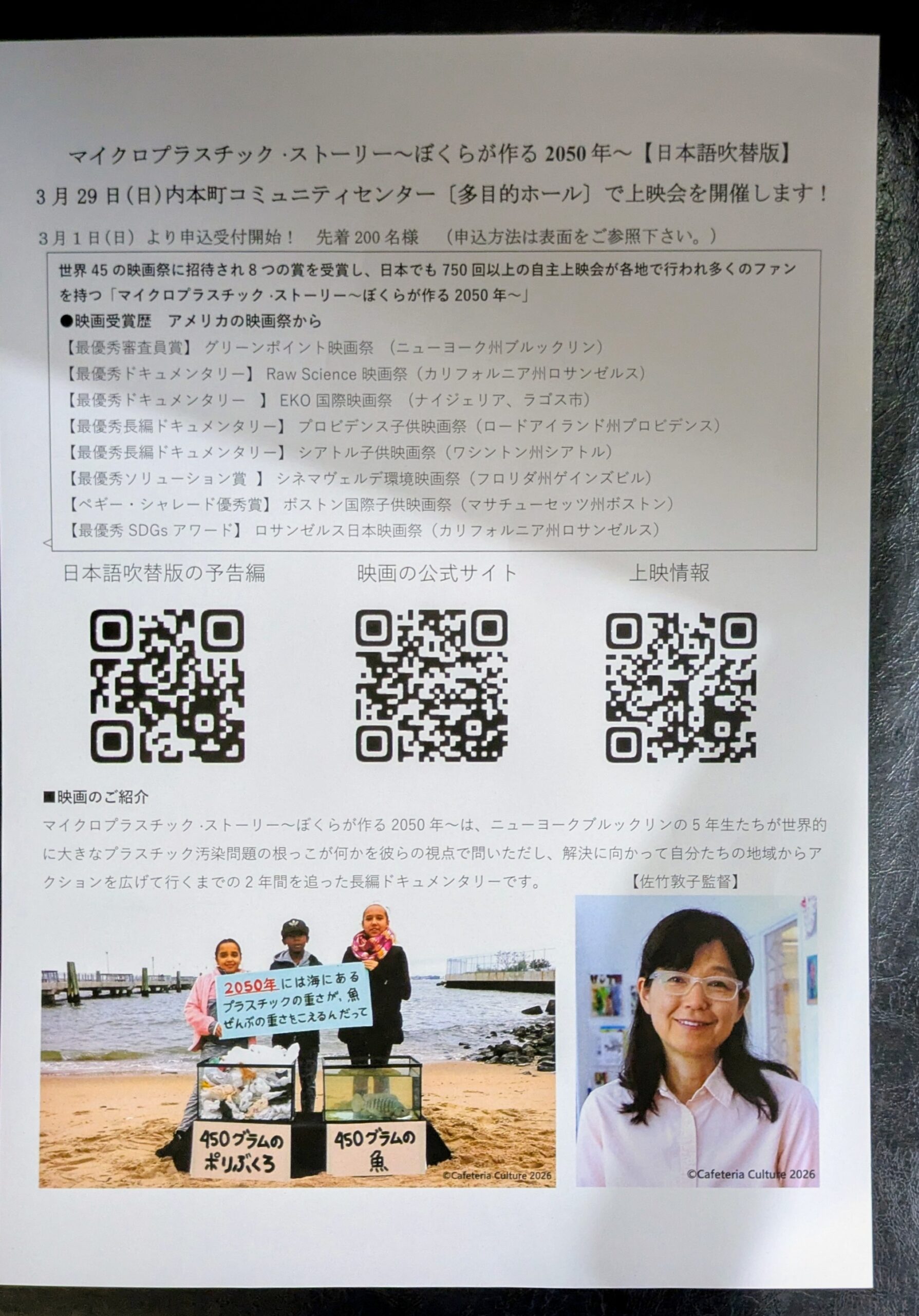 3月29日(日)に内本町コミュニティセンターで「マイクロプラスチック・ストーリー ぼくらが作る2050年」が上映される。