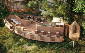 五月山の丘に元から立つ木々を可能な限り残し、自然の地形に寄り添うように設計された「丘の上のレストラン」。まるで森の中にリビングを持ち出したような開放的な空間には大きな窓を配置し、大阪平野の絶景と木々の緑がシームレスにつながる、非日常感あふれるアウトドアリビングに。
