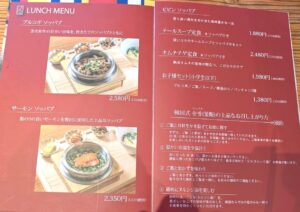 メニューはコチラ。「プルコギソッパプ/2580円」「サーモンソッパプ/2350円」「ビビンソッパプ/1880円」「テールスープ定食(ソッパプ付)/2480円」「キムチチゲ定食(ソッパブ付)/1980円」「お子様セット(小学生以下)/1380円」。