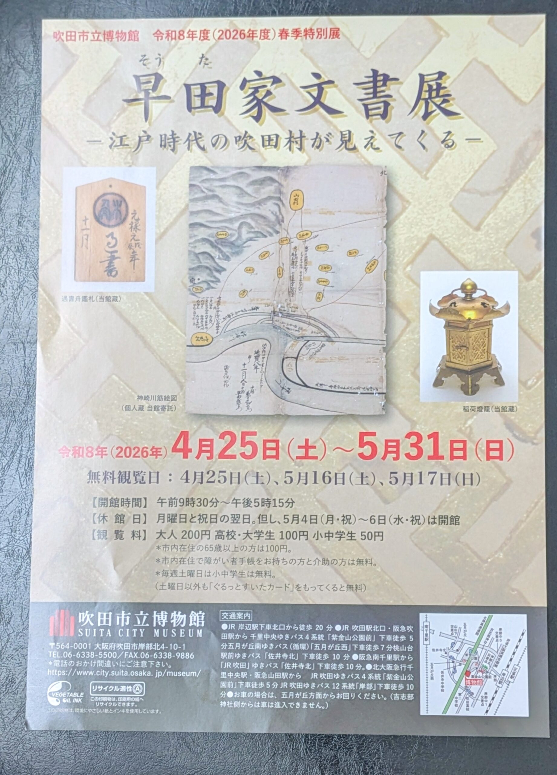 -吹田市-【吹田市立博物館】で春季特別展「早田家文書展 -江戸時代の吹田村が見えてくる-」開催 4月25日(土)から 4月25日(土)、5月16日(土)、5月17日(日)は無料観覧日