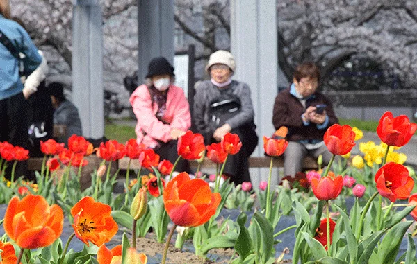 広場を彩る赤、黄、ピンク、白、オレンジのチューリップは、西面自治会と実行組合のメンバーが中心となって、植え付け、日々手入れを続けてきたもので、毎年この時期に美しい花を咲かせる。同広場周辺には、延長約3000メートルの遊歩道やベンチなどが整備されていて、色とりどりの花を眺めることができる憩いの場として市民に親しまれている。2日時点では、6分程度が開花していて、4月中旬頃まで楽しめる予定。