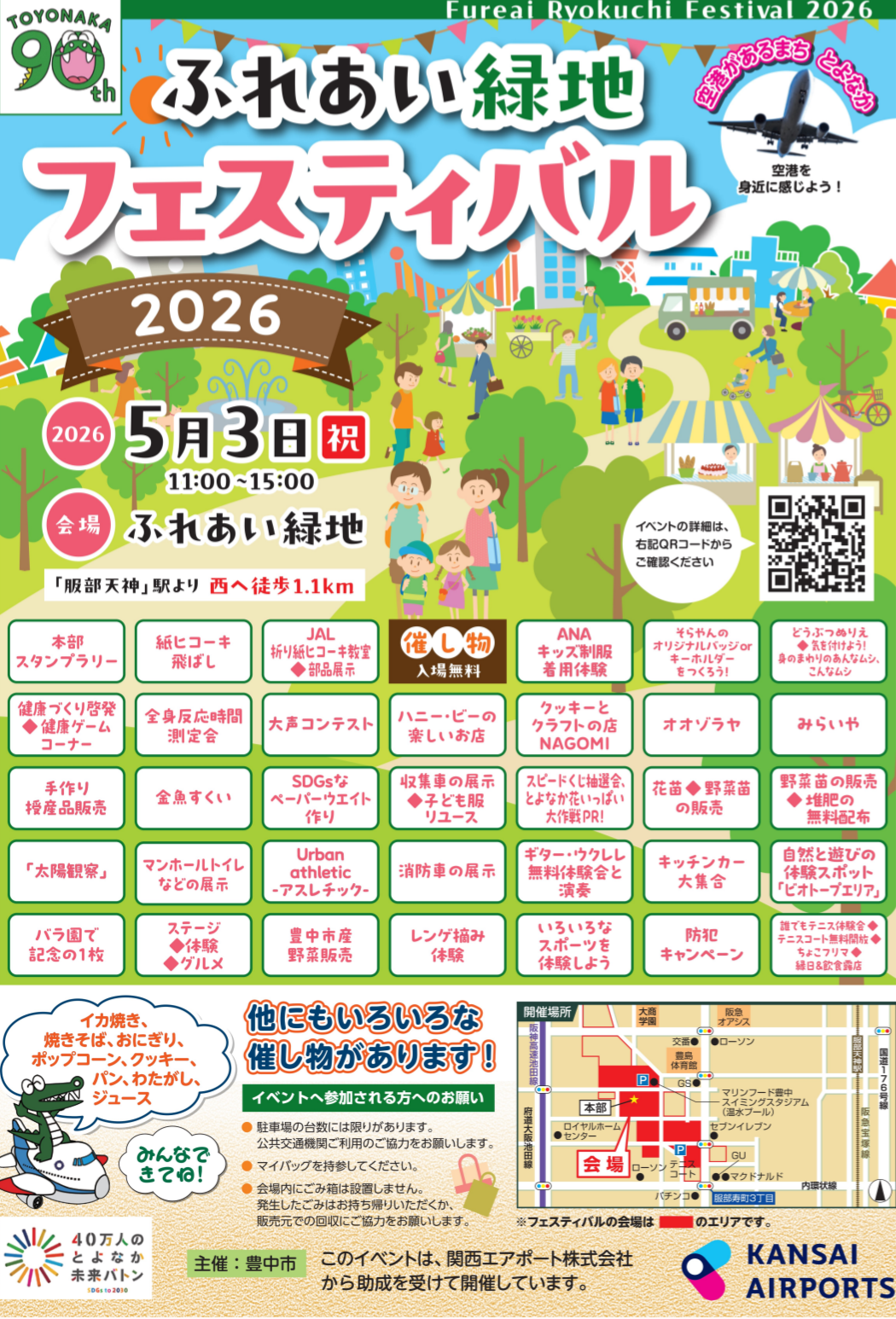 豊中市は、ゴールデンウィーク中の5月3日(日・祝)にふれあい緑地(服部西町)で、恒例イベント「ふれあい緑地フェスティバル2026」を開催する。