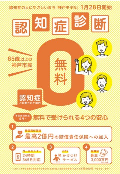 神戸市では、65歳以上の市民を対象に認知症の診断助成制度と事故救済制度を組み合わせて実施する助成制度「神戸モデル」がスタート。平成28年9月にG7保健大臣会合が開催され、認知症対策を盛り込んだ「神戸宣言」を出した。その後、「神戸市認知症の人にやさしいまちづくり条例」を制定、市民より制度への意見募集も実施しながら全国初の認知症助成制度を実現化。2019年度より、個人市民税均等割(現行3,500円)を市民1人あたり年間400円を増額し3,900円に改定。そのため利用者は自己負担金ゼロで検診を受けられる仕組みとなった。